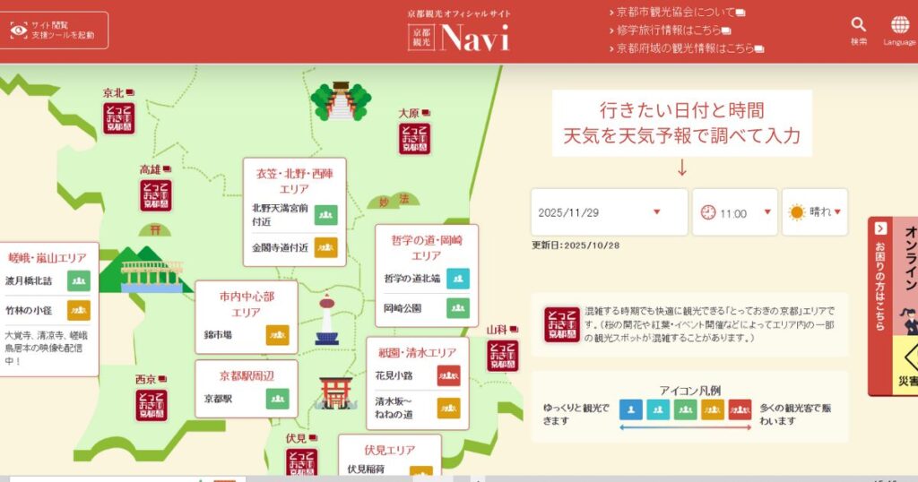 京都観光協会では、事前に混雑予想調べたり、ライブカメラで人気の観光地の様子をチェックできるサイトがあります。